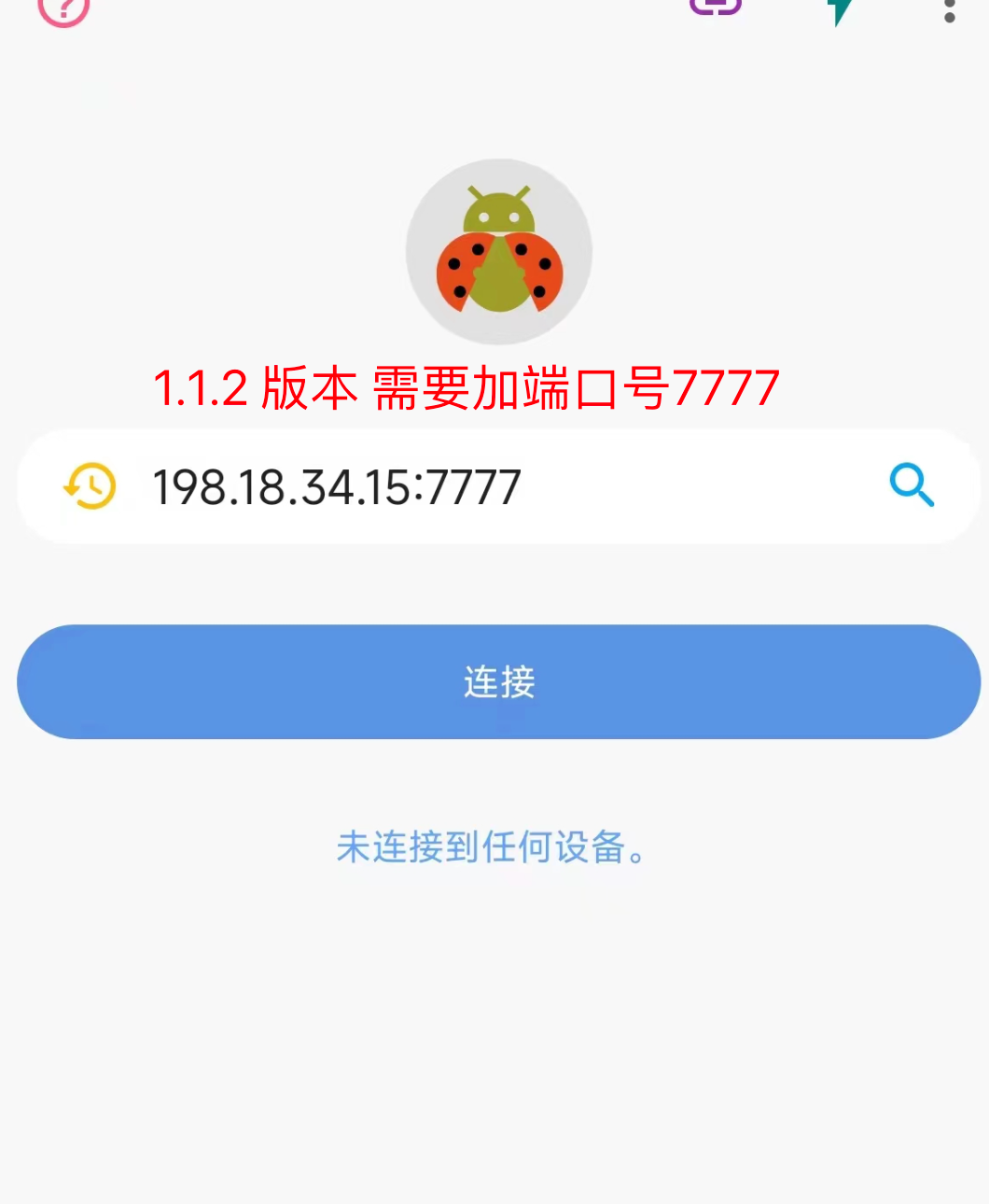 如果你的车机系统是 1.1.2 版本 ,输入 198.18.34.15:7777 连接车机。(英文冒号)